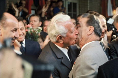 Le baiser fraternel de Leonid Brejnev et Erich Honecker lors du trentième anniversaire de la RDA (photographie de Régis Bossu, 1979)
